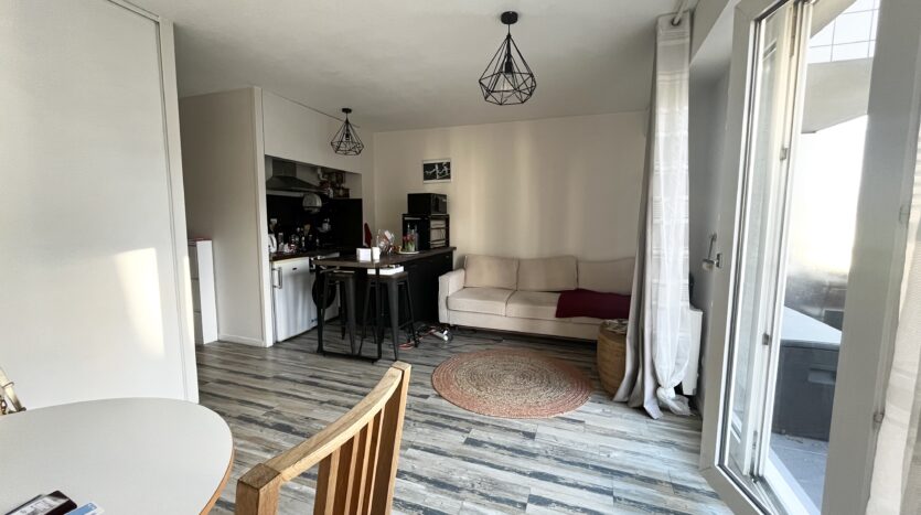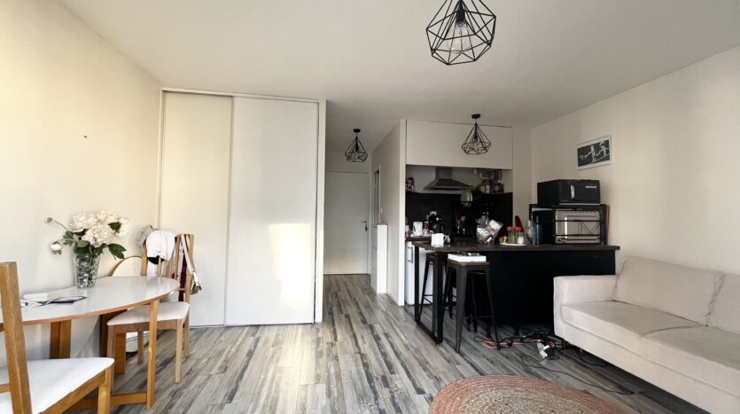 T2 comprenant: une entrée, une pièce de vie avec cuisine ouverte équipée donnant sur l’extérieur, 1 chambre, une salle d’eau avec toilette.