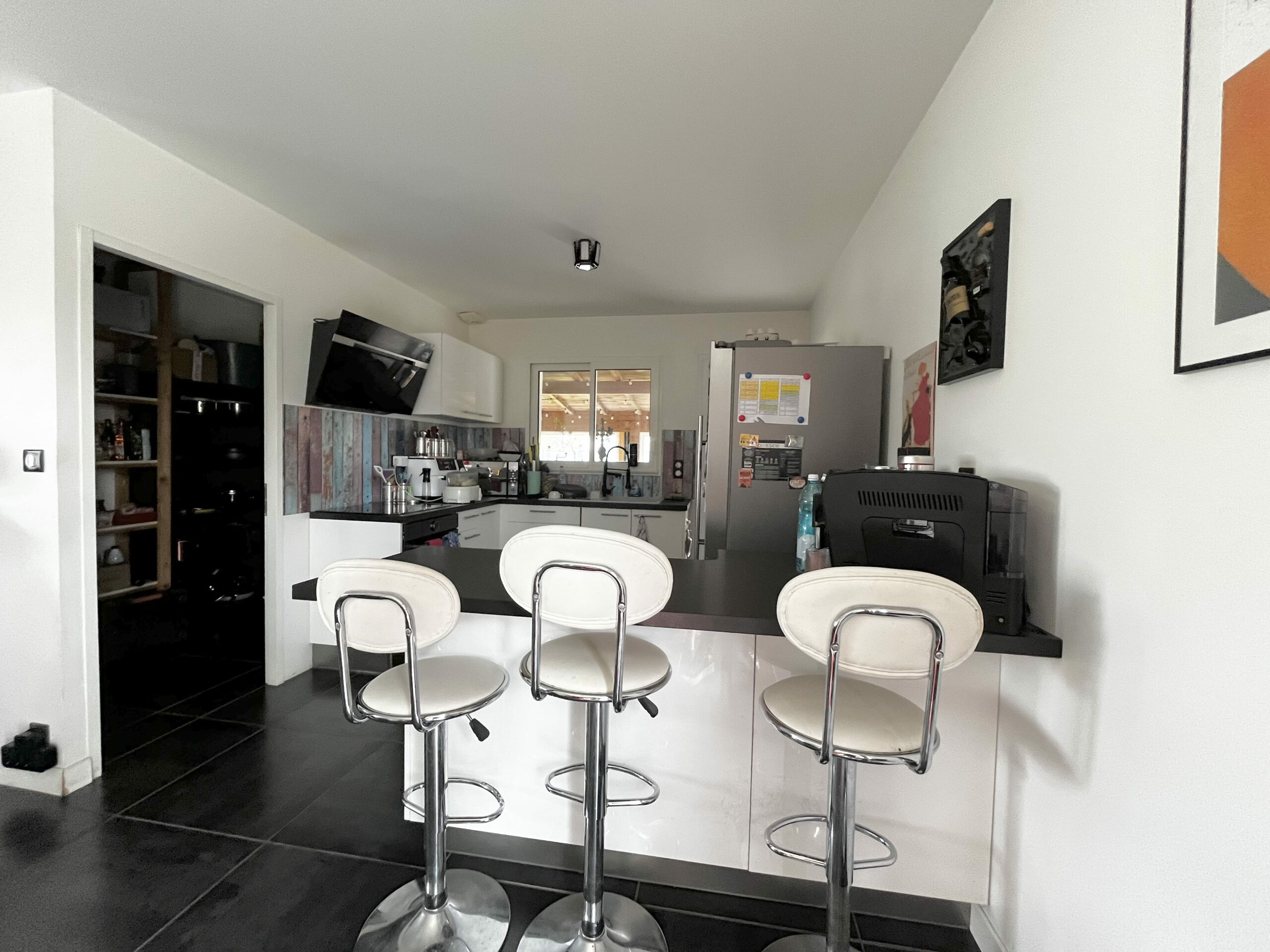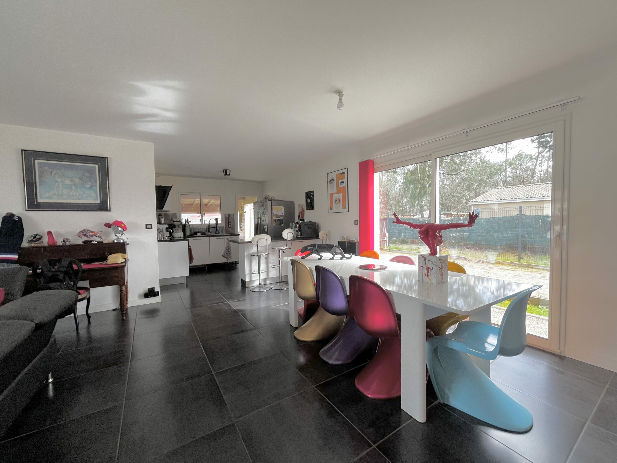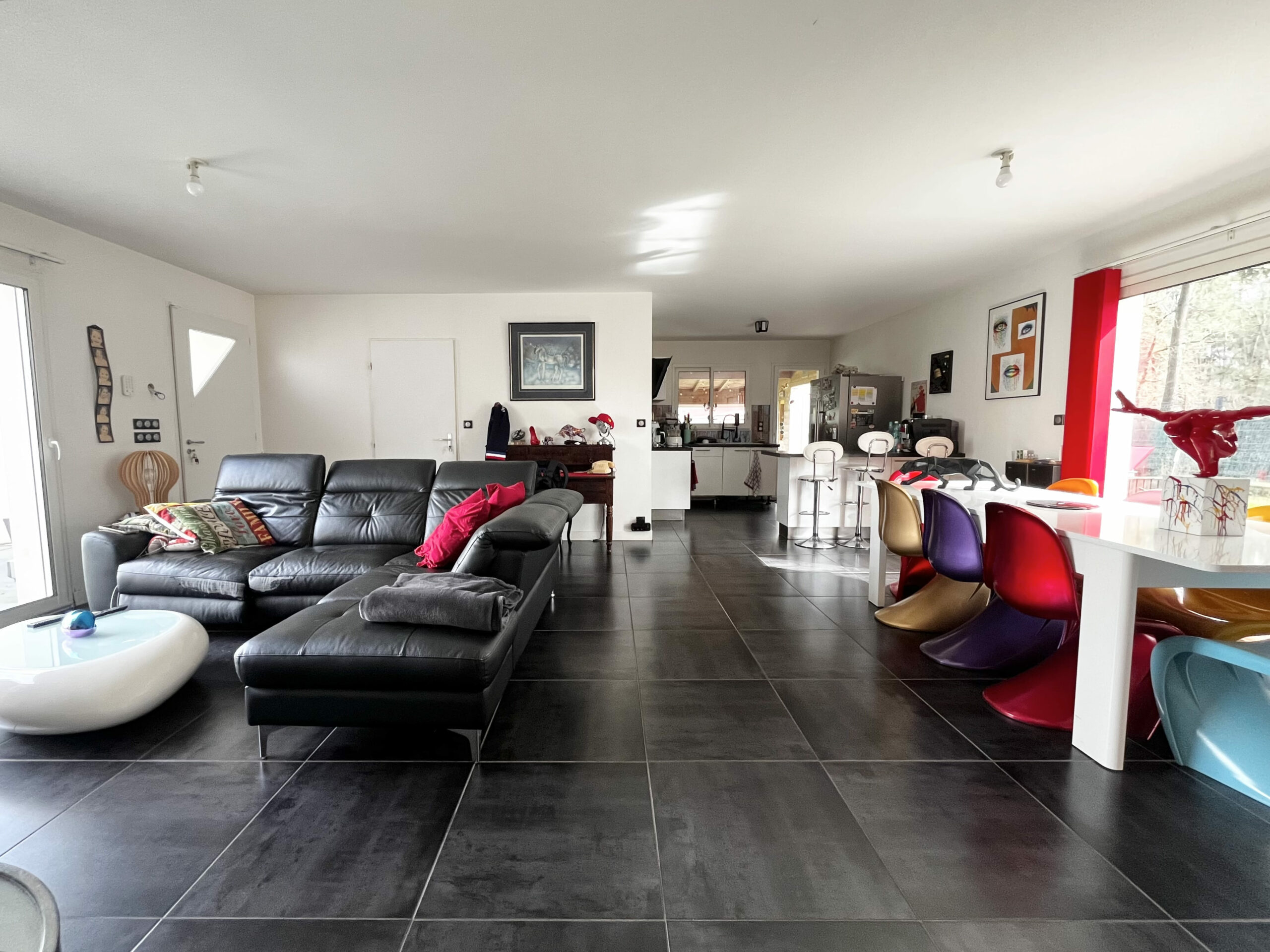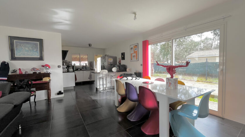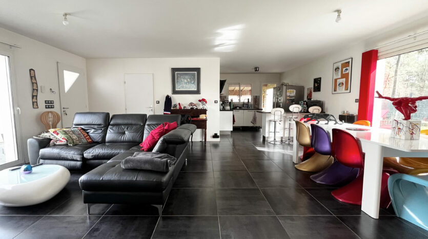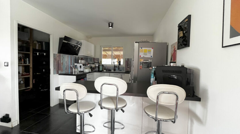 Très fonctionnelle et parfaitement agencée, elle se compose d’une pièce de vie traversante avec cuisine ouverte entièrement équipée d’environ 47 m2, offrant un espace lumineux et convivial. Un cellier attenant à la cuisine vient compléter cet espace, très pratique pour le quotidien. Et un bureau.